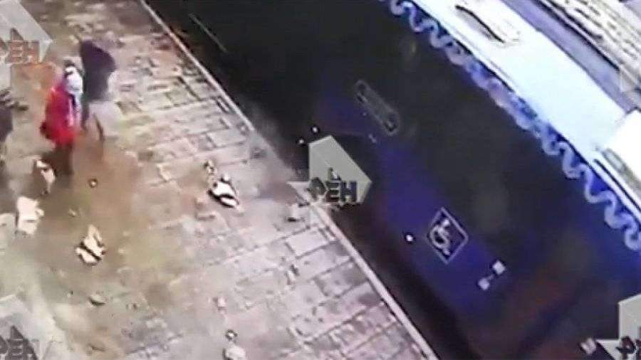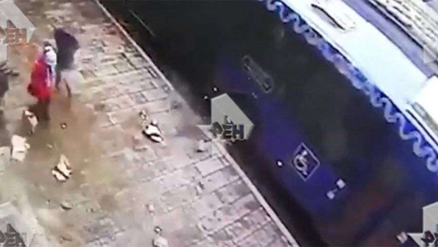 На кадрах, опубликованных на сайте РЕН ТВ, видно, как по тротуару идут женщина и двое детей. Неожиданно на них с высоты падают куски балкона. По словам матери, сын успел отскочить, а на дочку попало несколько кусков.