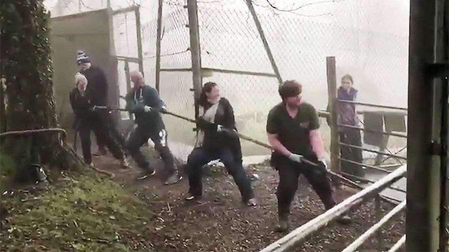На кадрах, опубликованных в соцсетях, видно, как несколько человек забрасывают канат с куском мяса в вольер к хищнику. Как только лев бросается на добычу, посетители начинают тянуть канат, чтобы вырвать из его пасти еду.
