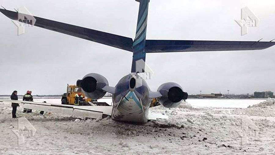 Как видно на кадрах, опубликованных телеканалом РЕН ТВ, самолет сильно занесло и он скользил по полосе боком, пытаясь удержаться. В итоге воздушное судно всё же съехало с ВПП и «зарылось» в снег.