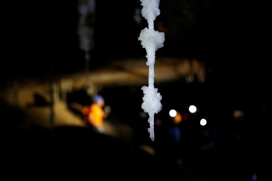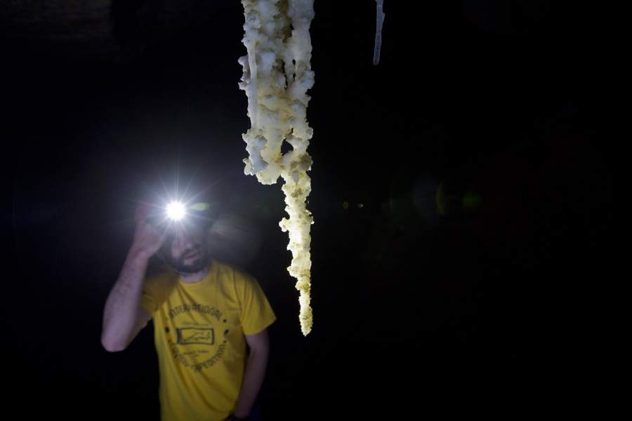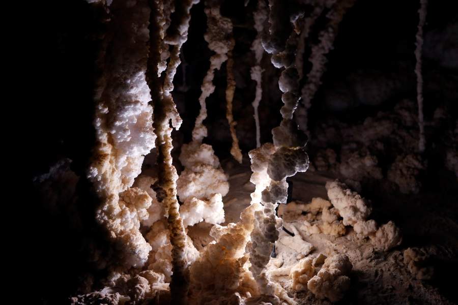 Внутри соляная пещера покрыта мелкой пылью, которую надувает сюда из пустыни. Поэтому некоторые соляные отложения оранжевого цвета. Соляные сталактиты, сталагмиты и колонны идеально белого цвета