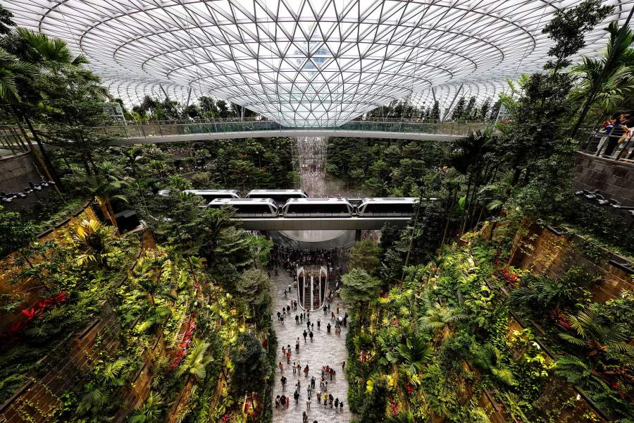 Аэропорт Чанги — единственный в Сингапуре — уже десятки раз получал звание лучшего в мире. Новая достопримечательность сингапурской авиагавани — самый большой в мире крытый водопад Rain Vortex («Дождевой вихрь»), его высота составляет 40 м. В ночное время здесь будут проходить звуковые и световые шоу. Вокруг него расположилась огромная зеленая долина Forest Valley, где растут тысячи деревьев, кустарников и цветов. Всего комплекс занимает 10 уровней, пять из которых — подземные. На верхнем этаже разбит парк Canopy с пешеходными тропами и аттракционами