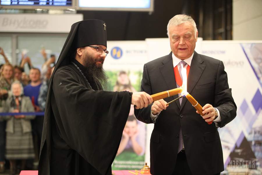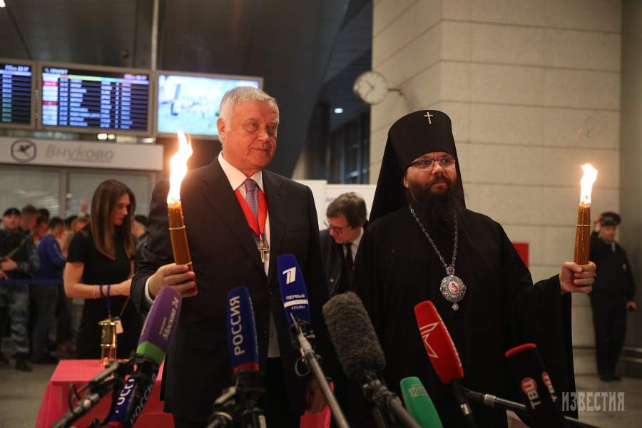 Якунин с Благодатным огнем, доставленным спецрейсом из Иерусалима в Москву