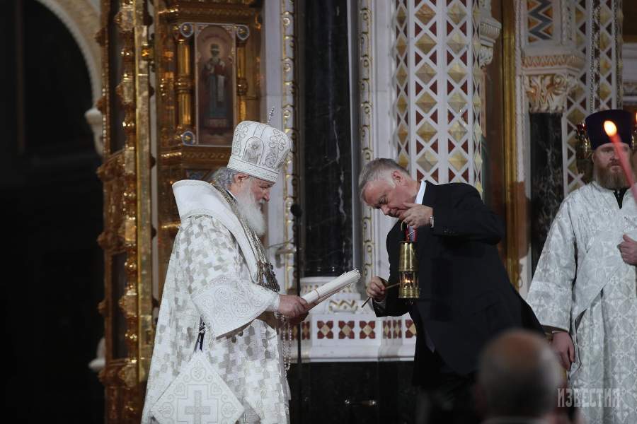 Председатель попечительского совета Фонда Андрея Первозванного (ФАП) Владимир Якунин (справа) передает патриарху Московскому и всея Руси Кириллу Благодатный огонь