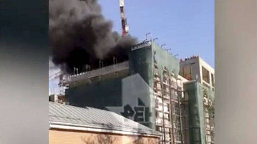 Вместе с тем очевидцы происшествия выкладывают в Сеть кадры с места ЧП, на которых видно, как над недостроенным зданием поднимается густой черный дым.