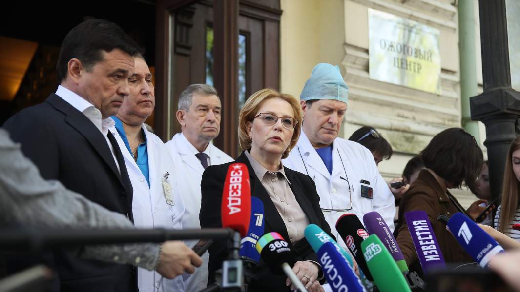 Губернатор Московской области Андрей Воробьев (слева) и министр здравоохранения РФ Вероника Скворцова (в центре) во время пресс-брифинга у здания Ожогового центра Национального медицинского исследовательского центра хирургии им. А. Вишневского, куда доставлена часть пострадавших при возгорании самолета Sukhoi Superjet 100 авиакомпании «Аэрофлот» в аэропорту Шереметьево