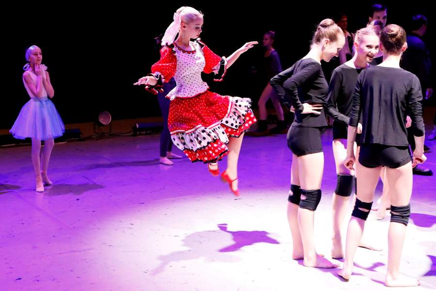 За кулисами во время экзаменационного спектакля выпускников факультета народного танца Красноярского хореографического училища