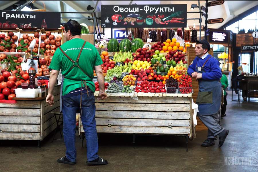 Продавцы у прилавка на Даниловском рынке в Москве