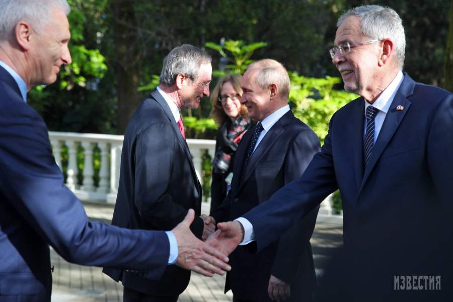 Владимир Путин и президент Ассоциации европейских торгово-промышленных палат Кристоф Ляйтль во время встречи российского главы государства с президентом Австрии Александром Ван дер Белленом (на фото австрийский лидер — на первом плане справа, слева — помощник президента РФ Андрей Фурсенко)