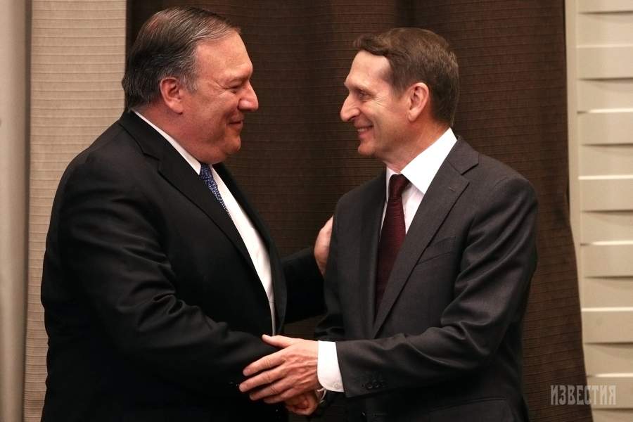 Госсекретарь США Майк Помпео (слева) и руководитель российской Службы внешней разведки Сергей Нарышкин в ходе визита Майка Помпео в Сочи для встречи с президентом РФ Владимиром Путиным