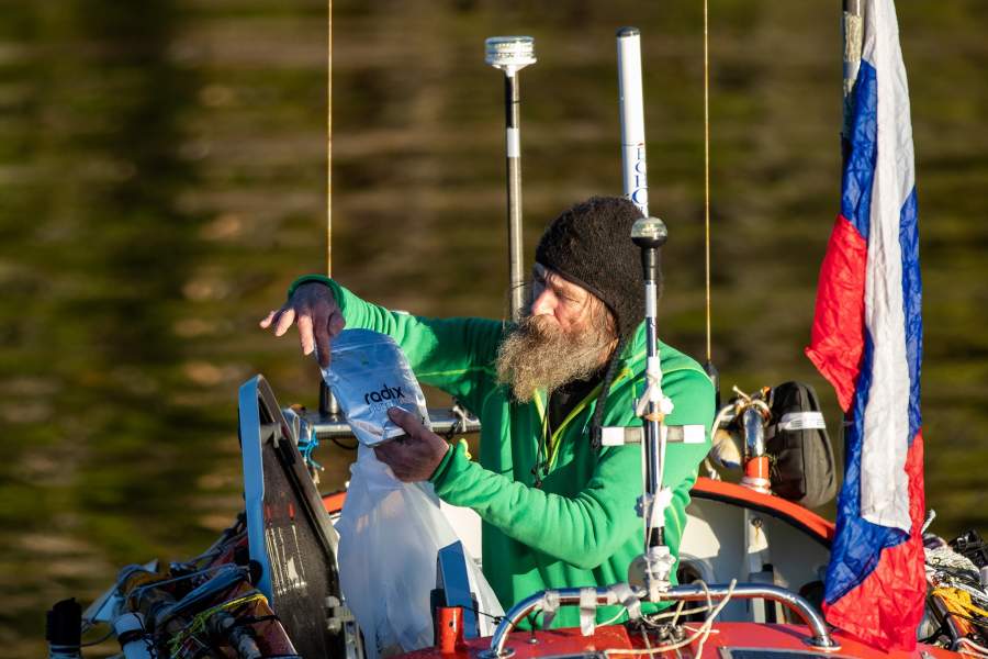 Операцию по буксировке лодки и подъему путешественника на борт яхты надо было провести максимум за три часа — дольше не позволяли погодные условия. Подняться с весельной лодки на яхту было нельзя: океанские волны могли разбить ее о стальные борта. Четыре часа «Акрос» с капитаном внутри тянули против волн и встречного ветра. Удары были такие, что вся команда серьезно беспокоилась за здоровье путешественника, приближался шторм. С яхты скинули резиновую лодку и на руках перебрались по буксировочному тросу к «Акросу», на палубе которого уже стоял Федор Конюхов, держа водонепроницаемую сумку с документами, видеокамерой и дневниками, которые он вел во время плавания