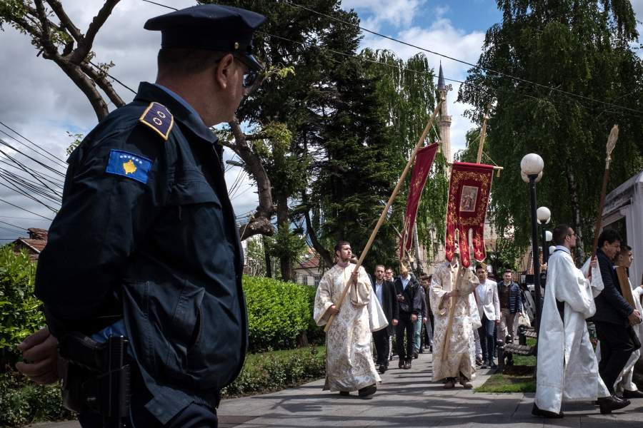 Офицер полиции Косово следит за порядком во время крестного хода православных сербов в преимущественно албанском Призрене