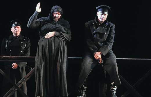 Действие разыгрывается на черном заднике, на массивных платформах, то вращающихся, то вздыбленных, и вокруг столба с оборванными проводами, который считывается как распятие (сценограф Александр Боровский). Это и Крым, и Константинополь, и Париж. И всюду героям Булгакова неуютно, всюду холодно, всюду тупик. И всюду смерть — массовка, играющая солдат Гражданской войны, буквально лежит на этих платформах чуть ли не все три часа.