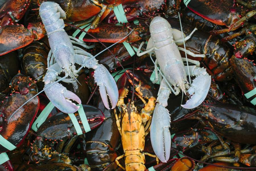 А это лобстеры-альбиносы. В 2014 году в водах американского штата Мэн удалось поймать сразу двух особей, хотя обычно шанс встретить хотя бы одного примерно один на сто миллионов