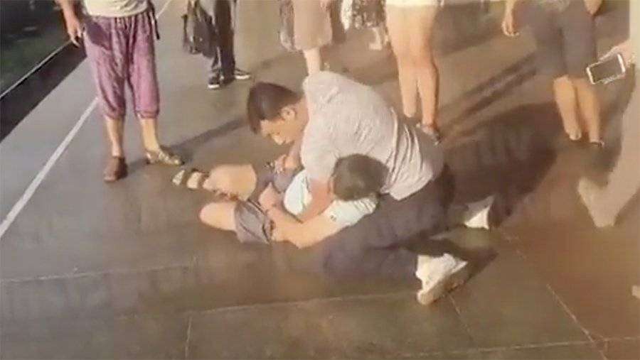 На представленных РЕН ТВ кадрах видно, как прохожий удерживает злоумышленника, который пытается вырваться.