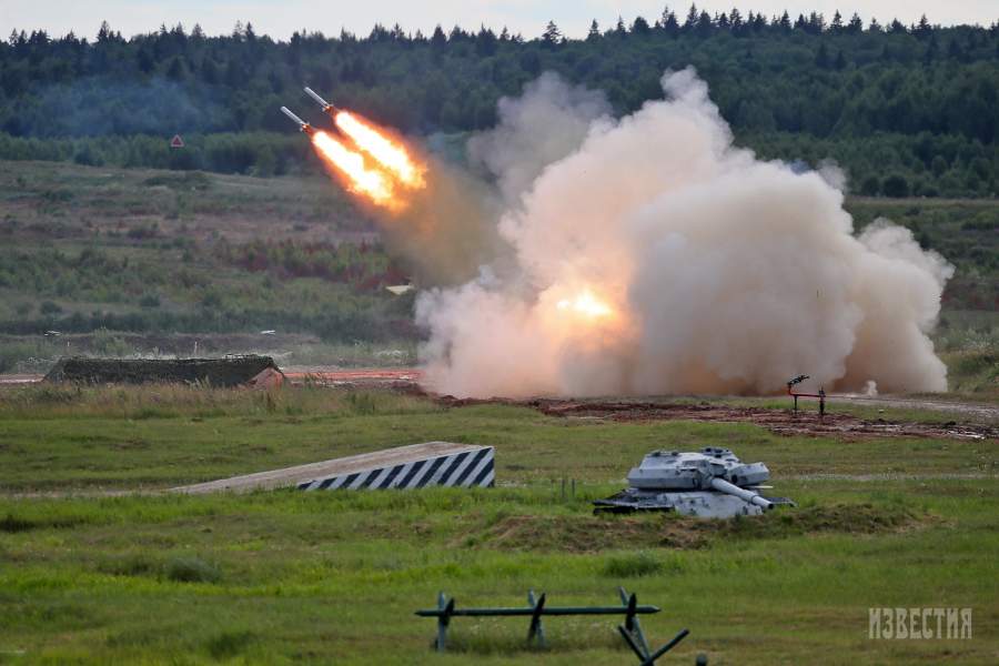 Стрельбы из тяжелой огнеметной системы ТОС-1А «Солнцепек» во время динамического показа современных и перспективных образцов вооружений, военной и специальной техники на форуме «Армия» в Подмосковье