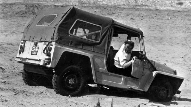 Так как новых прототипов успели выпустить всего семь и это товарные машины, то на бездорожье их не пустили, а выдали для тестирования один из ранних образцов. Судя по изнанке капота, этот тот самый оранжевый экземпляр, который часто встречается на фотографиях. Сейчас он перекрашен в бордовый цвет. Как раз у этой машины крылья сделаны единой деталью, а вместо жесткого откидного колпака — мягкий верх.