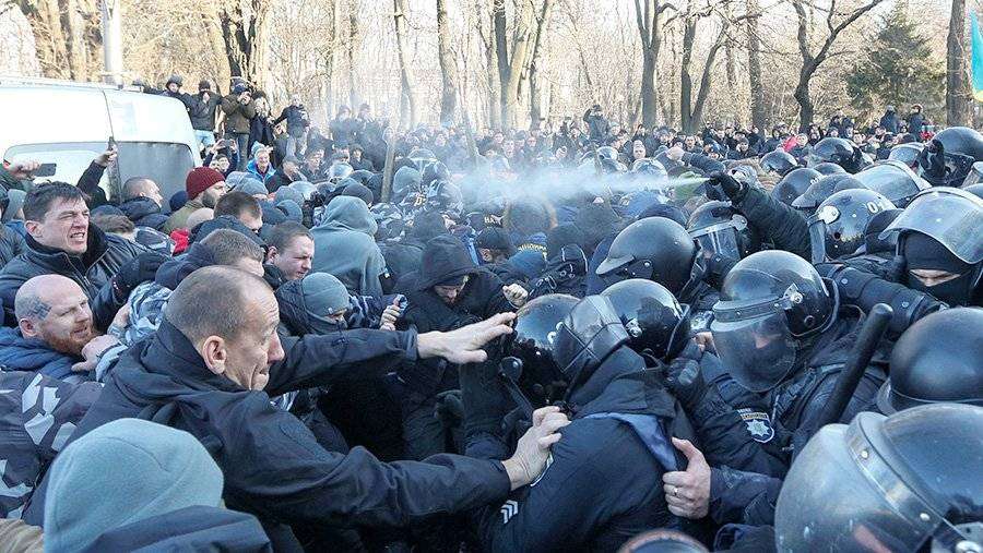 Ранее во вторник в киевском управлении нацполиции Украины рассказали, что, по предварительным данным, в результате конфликта с протестующими телесные повреждения получили двое полицейских. Отмечалось, что по подозрению в совершении противоправных действий в полицию доставили одного участника инцидента.