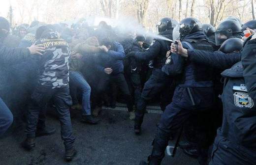 Как отмечало издание «Страна.ua», на митинге распылили перцовый газ. ТАСС сообщал, что правоохранители начали разгонять протестующих, а те — разбирать брусчатку и кидать в сотрудников правоохранительных органов камни. Издание «ОстроВ» со ссылкой на собственного корреспондента уточняет, что участники акции начали наносить удары по рядам правоохранителей палками. «Есть пострадавшие с обеих сторон. Одного из активистов в бессознательном состоянии забрала «скорая», — говорится в сообщении издания.