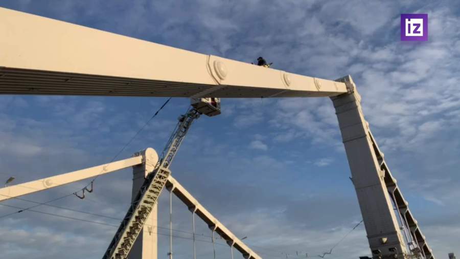 Мужчина залез на арку Крымского моста с плакатом