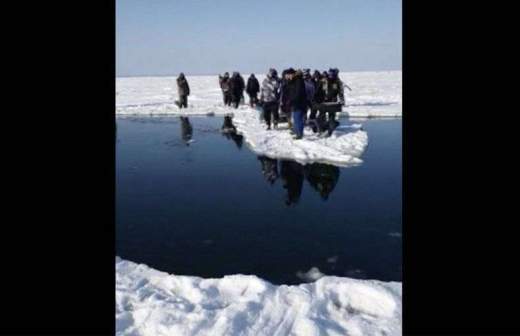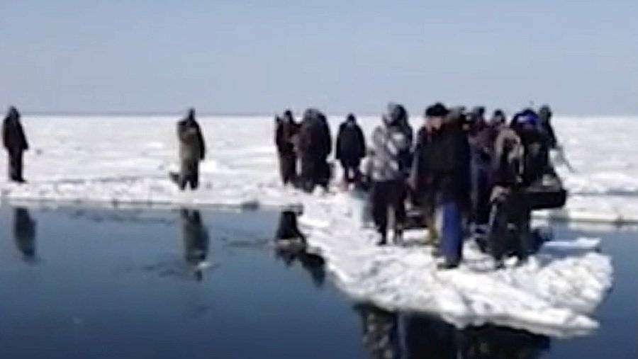 На кадрах видно людей, которые столпились на льдине. «Вот так вот мы и перебираемся», — говорит голос за кадром. Затем один из людей толкает небольшую льдину и перебирается по ней на берег.