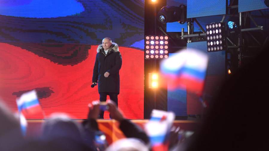 То, что поддержка Владимира Путина достигла исторического максимума, стало ясно еще по предварительным итогам обработки избирательных бюллетеней. За процессом подсчета следили и на митинге-концерте «Россия. Севастополь. Крым» в честь годовщины воссоединения полуострова РФ, проходившем после закрытия избирательных участков в центре Москвы. На Манежной площади собралось порядка 35 тыс. человек.