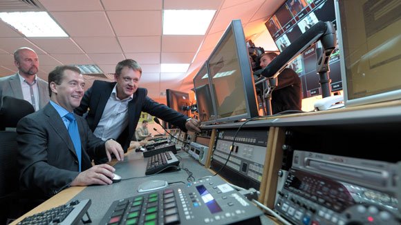 Затем президенту показали новейший мультимедийный комплекс, где разместился пресс-центр РИА и рабочие места сотрудников редакции. Одновременно в ньюс-руме может работать 400 человек. Журналисты не упустили возможность похвастаться достижениями в области фотографии. Зная о том, что президент - заядлый фотолюбитель - они рассказали ему о съемке в формате 3D. А сотрудники, которые "пиарят" агентство в социальных сетях, привели примеры ссылок на РИА в Facebook, Twitter и Живом Журнале. Оттуда нередко черпает новости со слов очевидцев и само агентство.