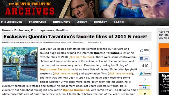 Сейчас список лучших фильмов, «по Тарантино», возглавил фильм Вуди Аллена «Полночь в Париже». В лучших оказались также безусловные фавориты нынешней оскаровской гонки — «Человек, который изменил все» с блистательным Брэдом Питтом, комедия создателя «Джуно» Джейсона Райтмана «Бедная богатая девочка» (в российский прокат фильм выходит 19 января) и «Артист» Мишеля Хазанавичюса.