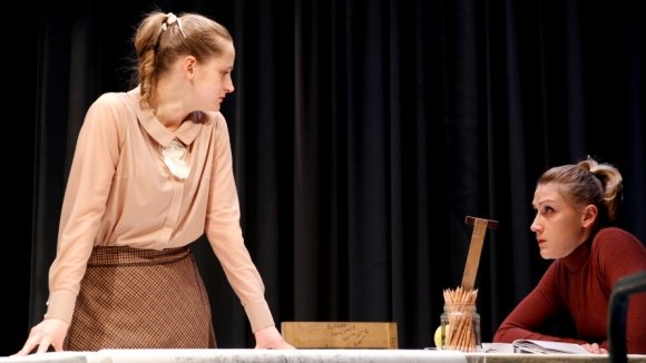 Важные выводы возникают сами собой. Но «Сестра Надежда» (так в «Табакерке» называется знаменитая пьеса) общественно-политическими подтекстами не озадачена. Режиссер увлекся зрелищем, выстроив спектакль в спектакле. Ход подсказала сцена в театральном институте, куда Надя (Алена Лаптева) пришла переживать за младшую сестру Лиду (Яна Сексте) и неожиданно сама оказалась в роли поступающей. Как быстро превратить комнату из коммуналки в аудиторию для прослушивания абитуриентов? Достаточно сделать вид, что предшествующее действие было студенческим спектаклем. Режиссер Кузькин (Дмитрий Бродецкий) журит третий курс за то, что не убрали за собой декорации. Быстро сдвигаются столы и койки, фанерные стены кухоньки, где Надя только что мыла посуду, а Лида делала уроки. И «как бы» идет экзамен. Надежда, страстно признающаяся в любви к театру словами Белинского, впервые осознает свою значимость.