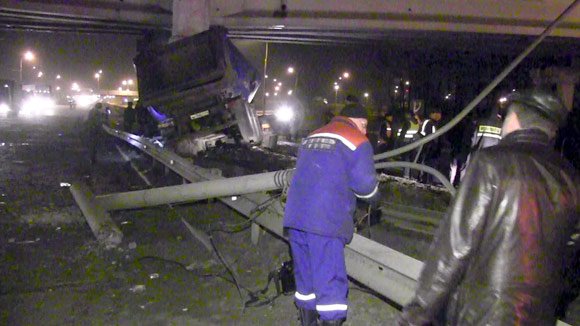 Авария произошла минувшей ночью на 35-м километре Каширского шоссе. Большегруз MAN, ехавший по трассе в сторону Москвы, на большой скорости врезался в опору железнодорожного моста. По словам очевидцев, спустя пять минут после ДТП по поврежденной части сооружения прошла электричка, из-за чего конструкция значительно просела, а сам поезд едва не пошел под откос. Ведущая ветка южного направления оказалась частично парализована.