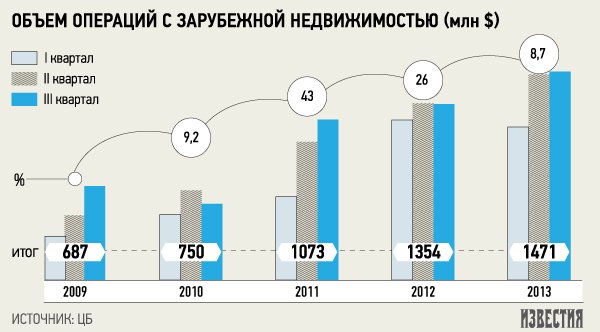 Всего на покупку заграничного жилья за девять месяцев 2013 года россияне потратили $1,5 млрд. За аналогичный период 2012 года рост составил 26%. В 2013 году темпы роста оказались даже ниже, чем в посткризисном 2010-м, когда объем операций с зарубежной недвижимостью увеличился на 9,2%.