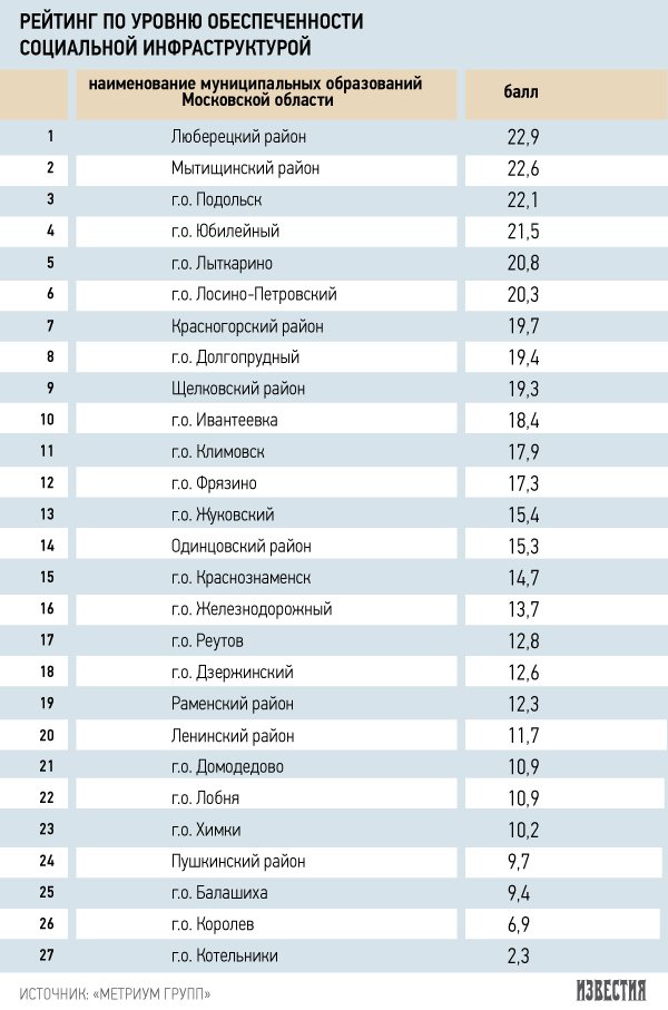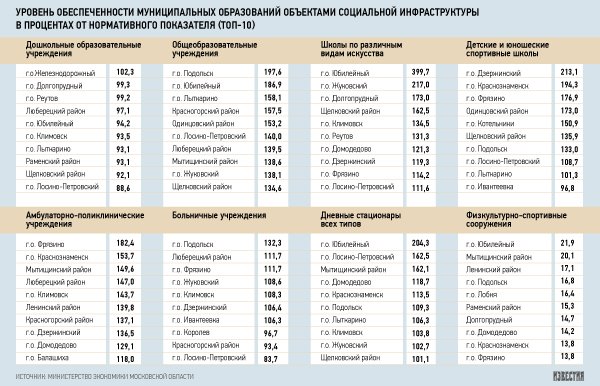 Ни один из городов Подмосковья не обеспечен на 100% всей необходимой социальной инфраструктурой (школы, детские сады, больницы и т.п.). Такие данные приводит отчет, подготовленный экспертами компании «Метриум Групп». Связано это с тем, что Подмосковье в последнее время стремительно застраивается, при этом нередко в новых жилых массивах не находится места для социальных объектов. Как напомнила гендиректор компании Мария Литинецкая, во многом из-за проблем с инфраструктурой губернатор Подмосковья в прошлом году ввел мораторий на выдачу разрешений на строительство.