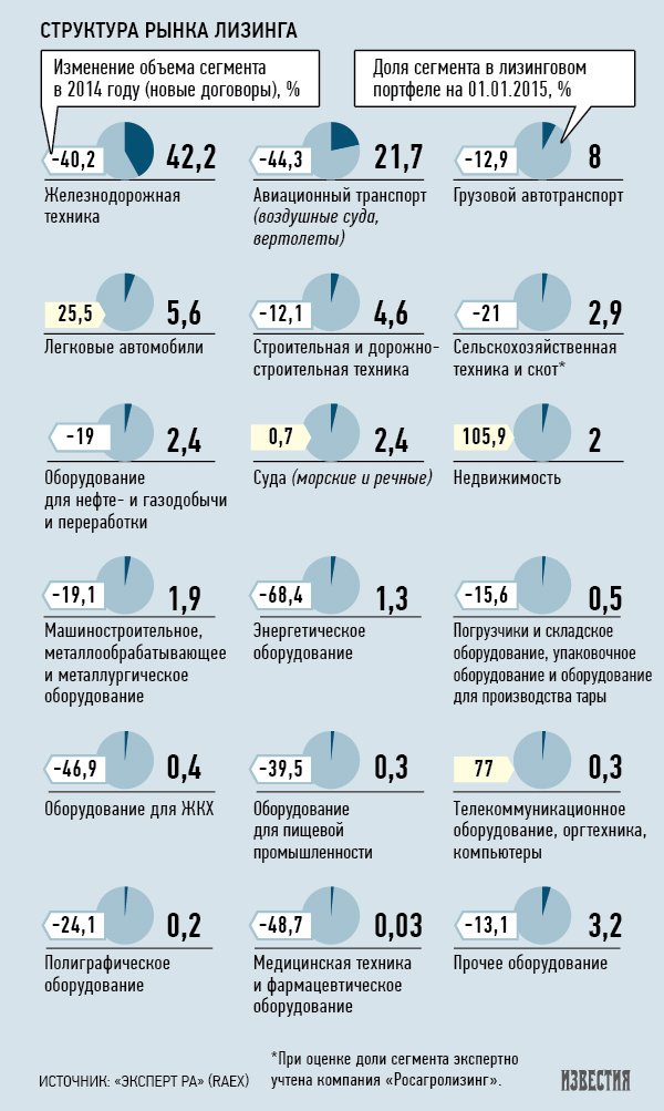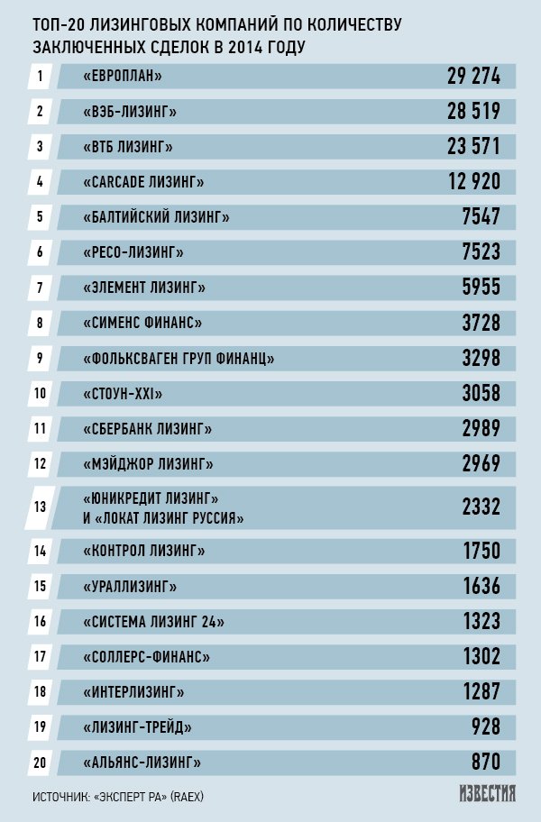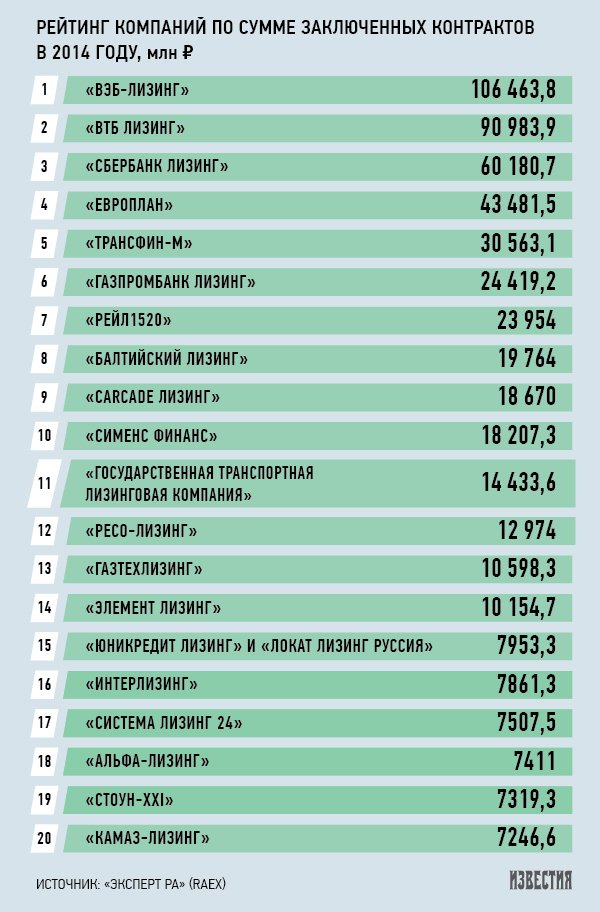 Среди лизингодателей лидером по объемам остался «ВЭБ-лизинг» (за 2014 год показатель составил 106,5 млрд рублей), в первую пятерку также вошли «ВТБ Лизинг» (91 млрд рублей), «Сбербанк лизинг» (60 млрд рублей), «Европлан» (43,4 млрд рублей) и «ТрансФин-М» (30,5 млрд рублей).
