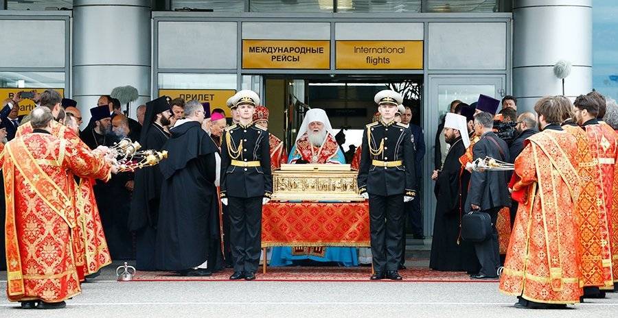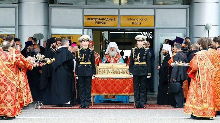 В аэропорту Внуково мощи святого встречает духовенство и рота почетного караула. Затем они будут доставлены в храм Христа Спасителя на вечернюю службу.