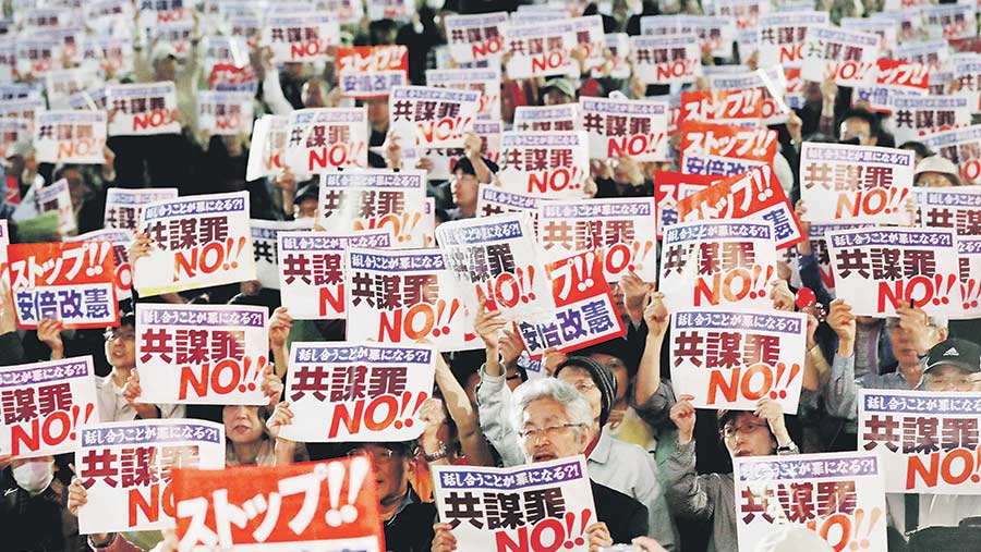 Глава японской Федерации ассоциаций адвокатов Юкио Ямасита заявил, что наказание по новому закону можно получить даже за использование поддельных марок или участие в соревновании на моторных лодках без соответствующей лицензии. Классифицировать как заговор можно будет и любые политические акции — например, если противники размещения в Японии новых американских военных баз захотят заблокировать подступы к месту их строительства.